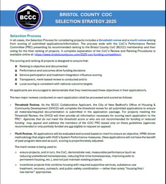 For the 2025 CoC funding cycle, the Bristol County Continuum of Care (BCCC) issues its guidance regarding its Selection Strategy for considering projects for funding. This document provides guidance as to the threshold review and merit reviews used in the review and evaluation of all new and renewal applications.